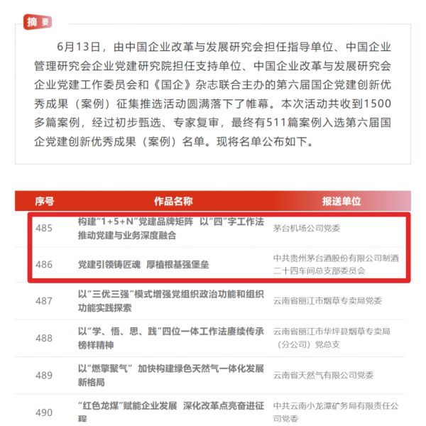 6月13日,由中国企业改革与发展研究会指导 黄瓜视频黄污APP下载,中国企业管理研究会企业党建研究院支持,中国企业改革与发展研究会企业党建工作委员会和《国企》杂志联合主办的第六届国企党建创新优秀成果(案例)名单揭晓,茅台集团下属党组织茅台机场公司党委和茅台酒股份公司制酒二十四车间党总支入选榜单。